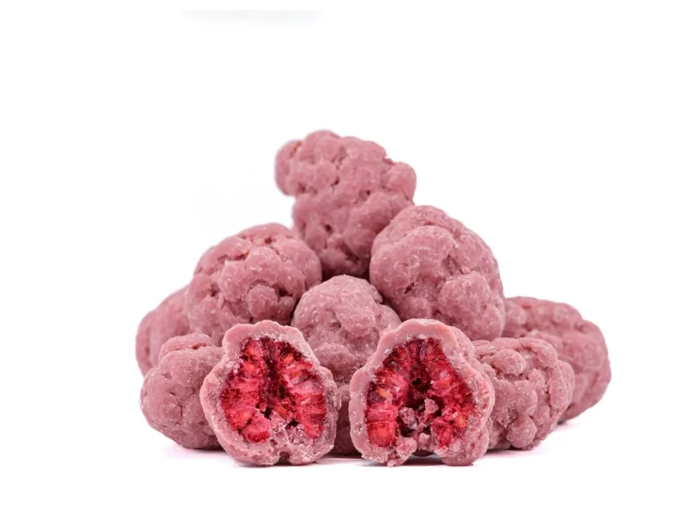 ruby čokoláda (kakaové máslo, cukr, mléko, emulgátor: sójový lecitin) 83,4%, mrazem sušené maliny 16,6%